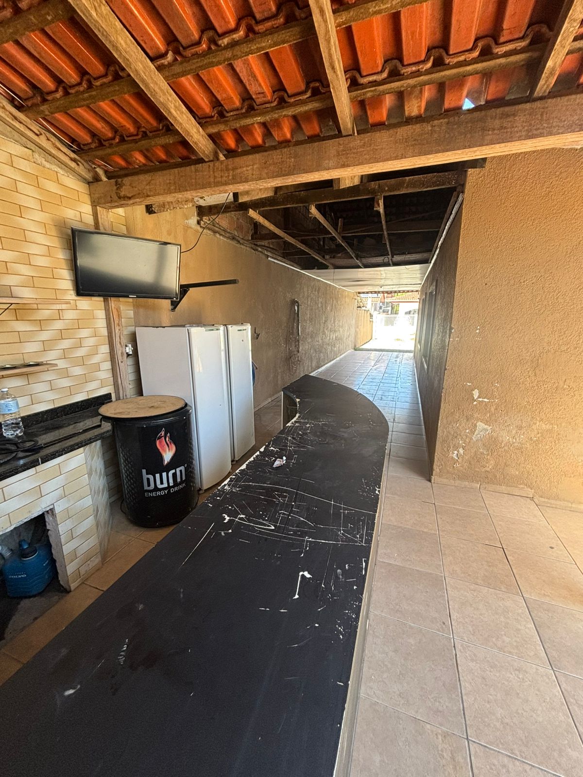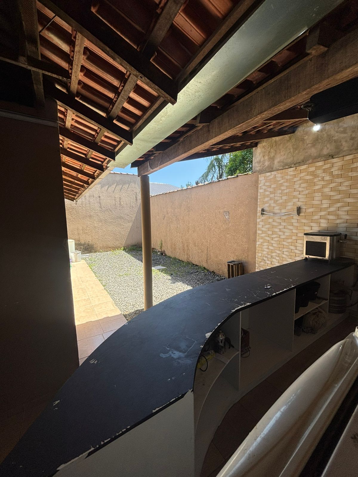 Área de churrasqueira com pia, freezer e geladeira