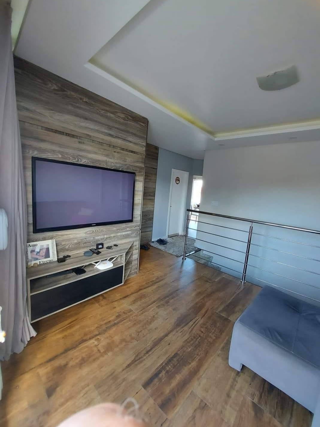 Sala moderna com piso porcelanato imitando madeira e painel de TV